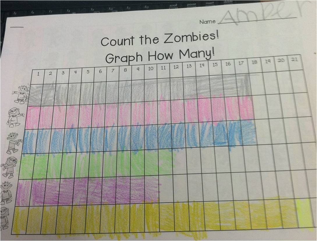 We started our week with this fun little graph from my Zombie Data pack. My babies wrote their names on Post Its and chose their Favorite Zombie. It was a super easy way to introduce bar graphs. It’s kinda hard in my room, to get a really good graph, because I only have 11 kids. Haha. Poor me, right?! ๐ But that’s why our graph is a little simple looking. After that, we counted up zombie cards and put them on a bar graph.