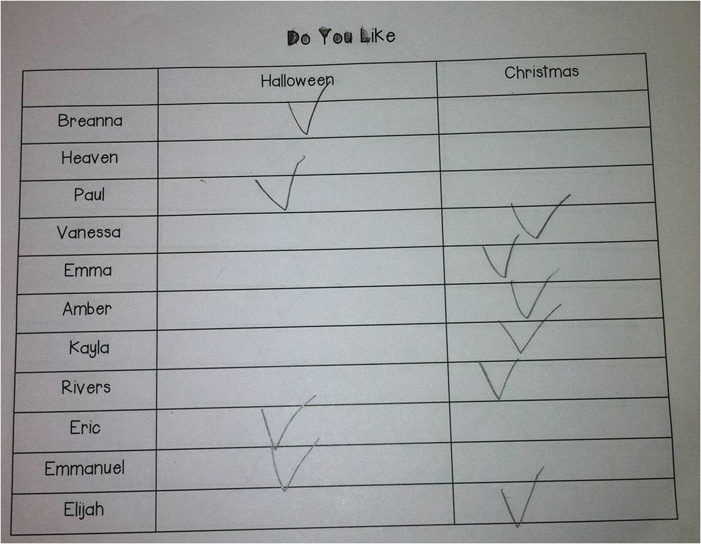 Finally, we did a little survey. I had like 4 surveys, and they chose what they wanted to ask their friends. Questions like “Ice Cream or Cookies?,” “Halloween or Christmas?” etc. I gave them a sheet with all their friends name so I could teach them how to make sure they got everyone’s opinion.