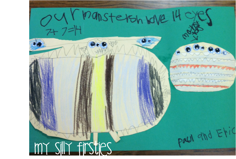 Then we got with a partner and glued them. Finally, we counted the eyes and wrote a number sentence. We used the sentence “Our monsters have ___ eyes.” I love that this one says “I s” hahaha. That IS how you spell it. 🙂
