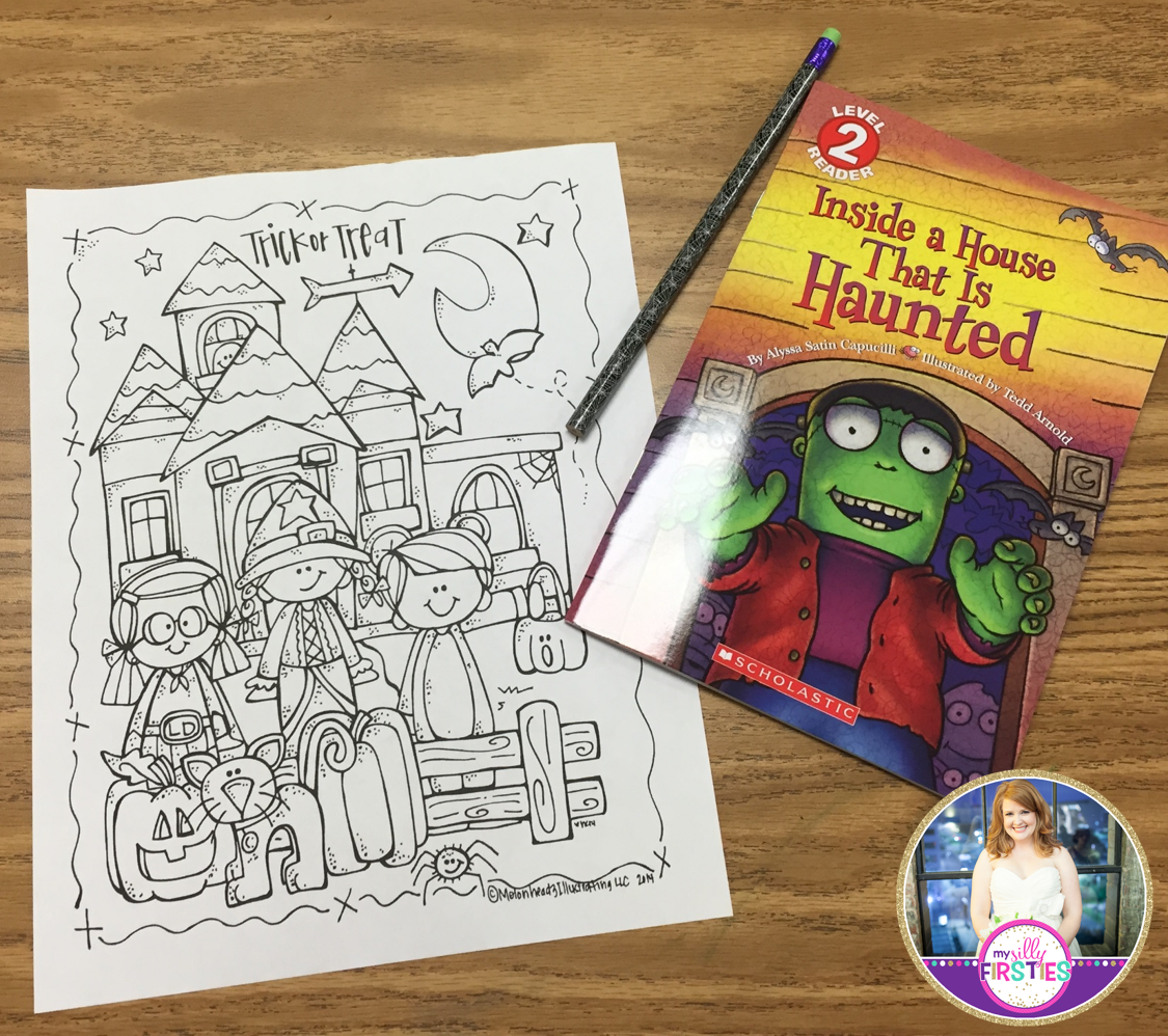 You can find the adorable coloring sheet on Melonheadz blog HERE! I grabbed Inside a House That is Haunted last month from Scholastic for $1.00. If you haven’t read it, it’s a great and super fun read aloud. It’s the same illustrator as Fly Guy which instantly scores it points with firsties! It has a really similar feel to the There Was An Old Lady Who Swallowed series because it’s very repetitive! My kiddos loved it!