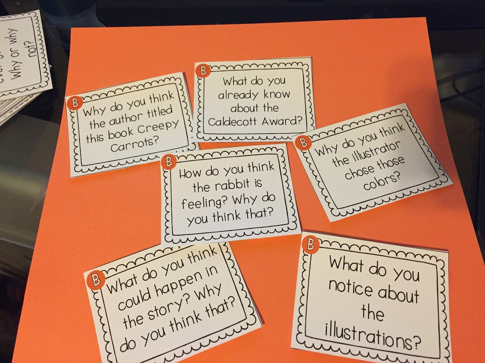 Of course, one of the most important parts of any read-aloud is the questions we ask before, during, and after the book. I created some question cards to use during my interactive read-aloud, but also to have partners talk about the book.