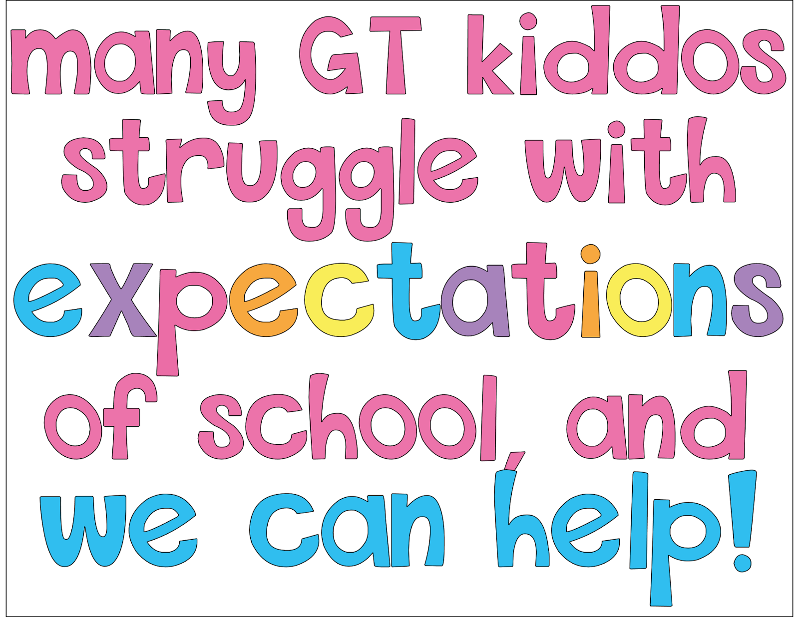 Kind of along the same lines, some GT kiddos really really struggle with the expectations of school. Of course this is true of LOTS of children…special ed, gen ed, etc. We have to TEACH them how to be kind, how to be respectful, because sometimes they truly don’t know. Of course this is true of all children. 🙂 In my experience, GT kiddos need the most help dealing with people or ideas that they think are “dumb.” I am constantly reminding them “we can’t say that’s a stupid idea, It’s hurtful.” They aren’t trying to be hurtful…they just see it as a stupid idea, haha!! So we must teach them how to control their words and their faces! Fortunately, we have reason on our side!